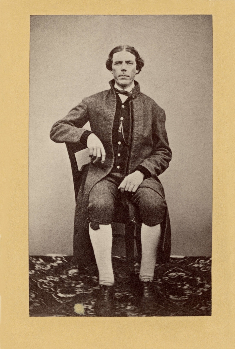 Ateljéporträtt. Man fotograferas sittande i helfigur rakt framifrån.