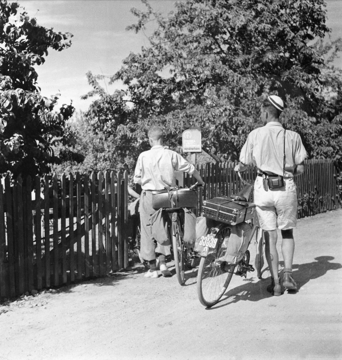 Cyklister, två unga män, utanför grinden till ett vandrarhem.