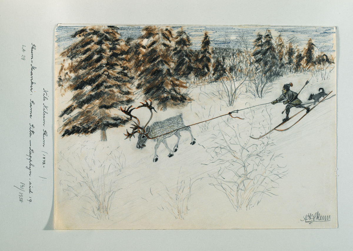 Teckning av Nils Nilsson Skum, troligen utförd mellan 1930 och 1938. En same på skidor blir dragen av/tolkar efter en ren. En hund springer efter. Vårvinter.