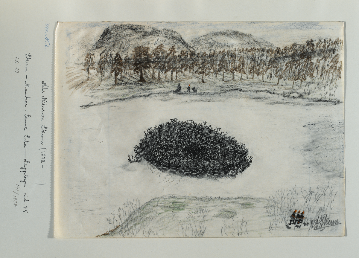 Teckning av Nils Nilsson Skum, troligen utförd mellan 1930 och 1938. Samer driver försiktigt sin renhjord över ett sel i älven. Höstsommar.
