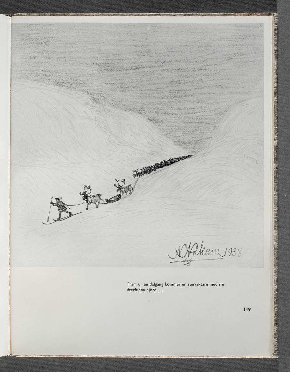 Teckning av Nils Nilsson Skum. Reproduktion ur boken "Samesita - Lappbyn". Bildtexten lyder "Fram ur en dalgång kommer en renvaktare med sin återfunna hjord ...". Vinter.