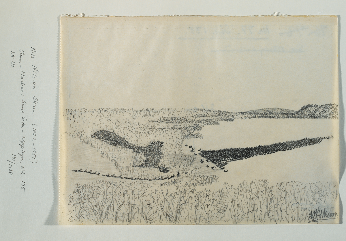 Teckning av Nils Nilsson Skum, troligen utförd mellan 1930 och 1938. Samer och renar i snöigt fjällandskap. Förtruppen går i förväg medan eftertruppen släpps på bete. Vinter.
