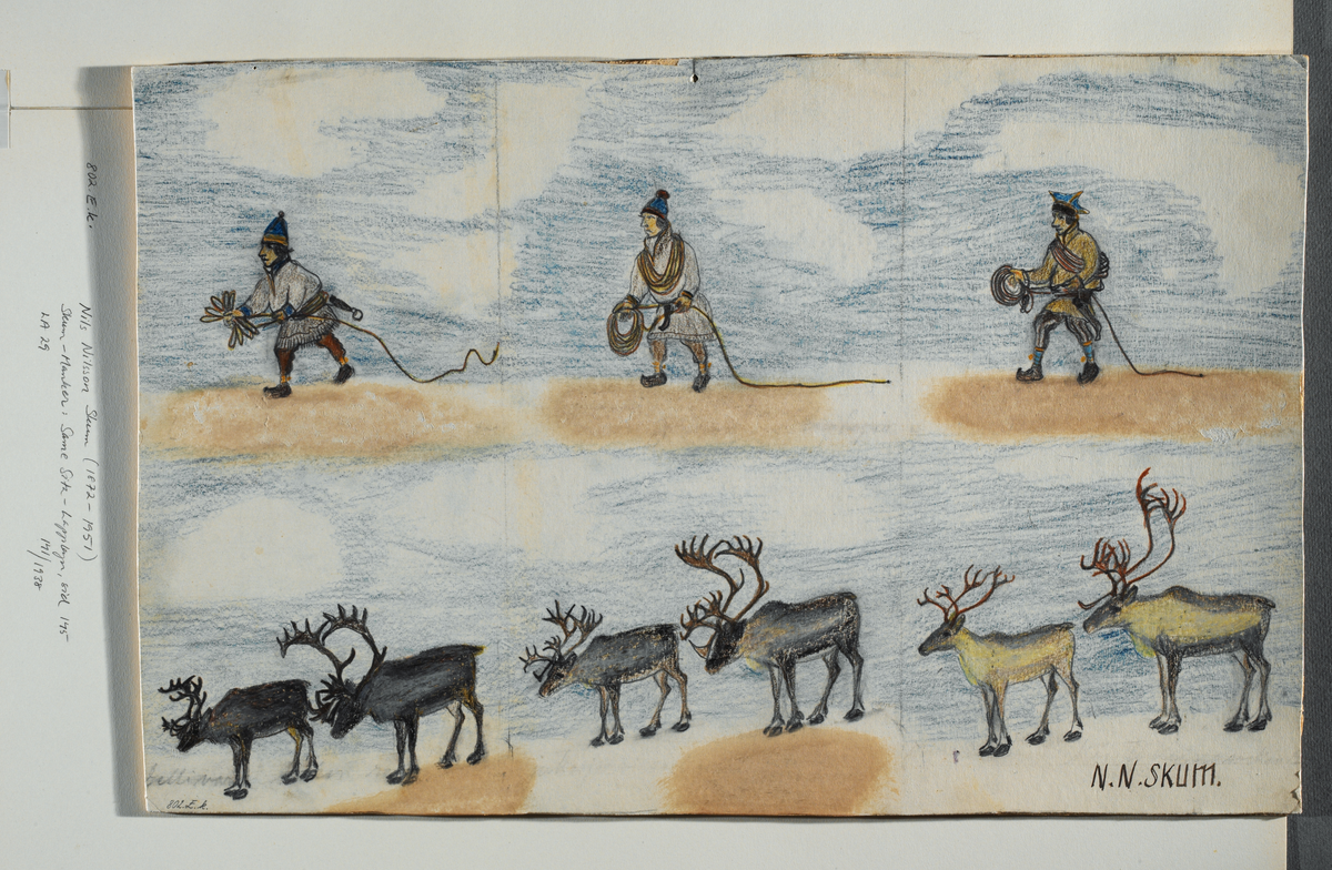 Teckning av Nils Nilsson Skum, troligen utförd mellan 1930 och 1938. Renskötare och renar från Gällivare, Jukkasjärvi och Kautokeino. Dräkterna, arbetsmetoderna och renarnas utseende varierar mellan de olika platserna.