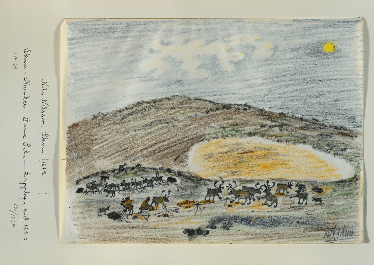 Teckning av Nils Nilsson Skum, troligen utförd mellan 1930 och 1938. Fastbundna renar och renskötare i fjällandskap.