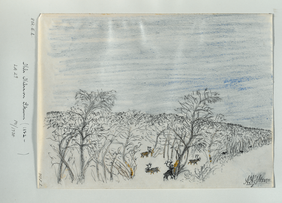 Teckning av Nils Nilsson Skum, troligen utförd mellan 1930 och 1938. Renar äter lav från träd.