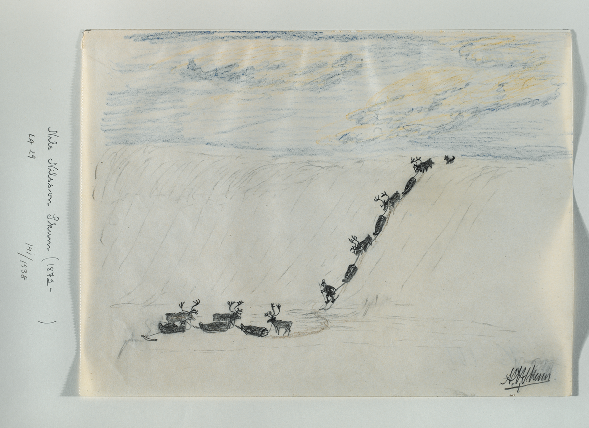 Teckning av Nils Nilsson Skum, troligen utförd mellan 1930 och 1938. Raiden går nedför fjället. Renar som drar ackjor, renskötare på skidor och hund.