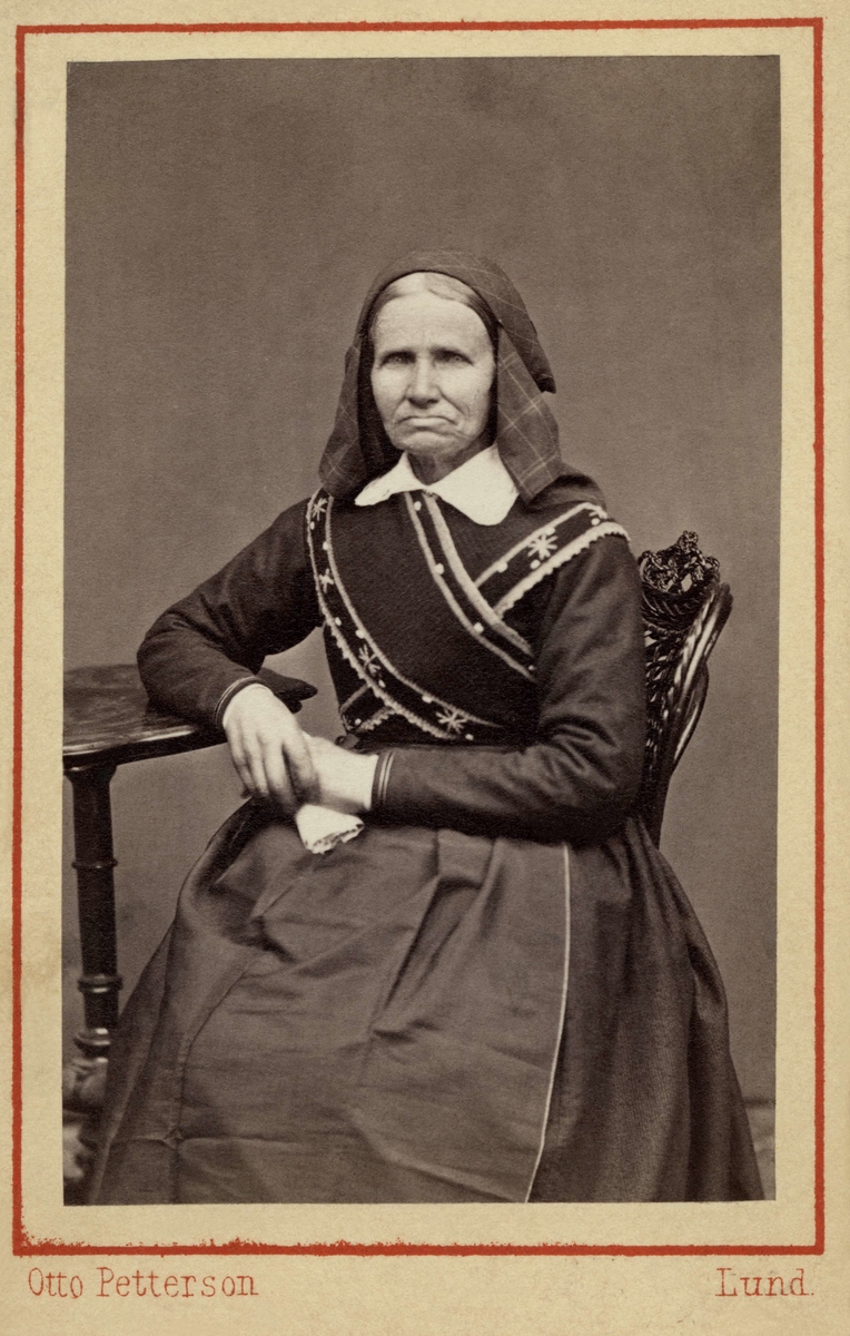 Kvinna poserar i en klänning med tillhörande förkläde och hätta