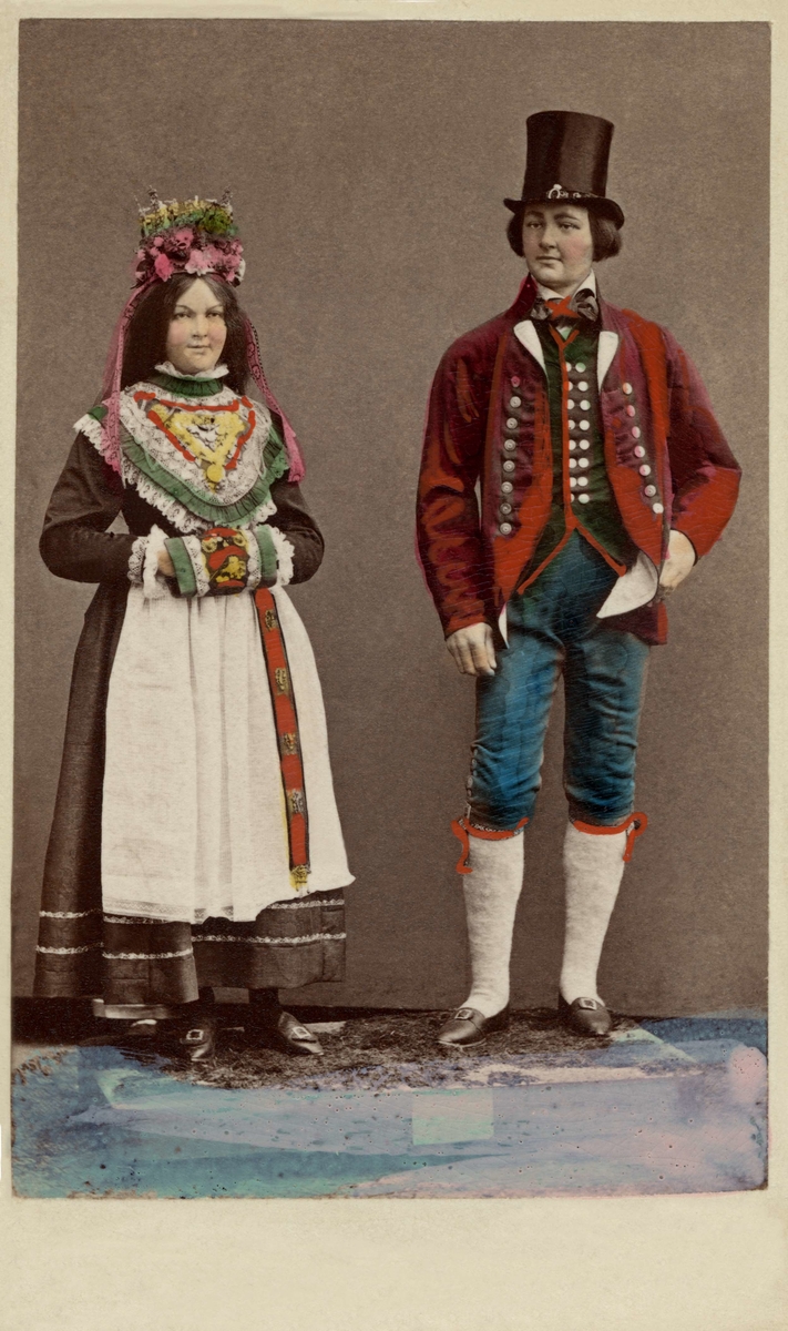 Ett foto från hovfotograferna Eurenius och Quist av två av de tio dräktdockor som var utställda i den norska avdelningen på världsutställningen i Paris 1867, Under koloreringen, av det ursprungligen monokroma fotografiet, anas plattan som dockorna står på. Figurerna är klädda i Bröllopsdräkt (Brude-dragter) från Søndmøre. Dräkterna hade ställts till utställningskommittens förfogande av prokurator Andreas Sanne i Aalesund.