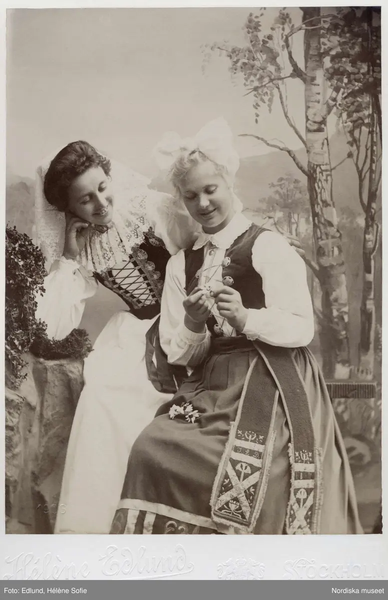 Ett foto på två kvinnor klädda i folkdräkt från Skåne eller Småland.