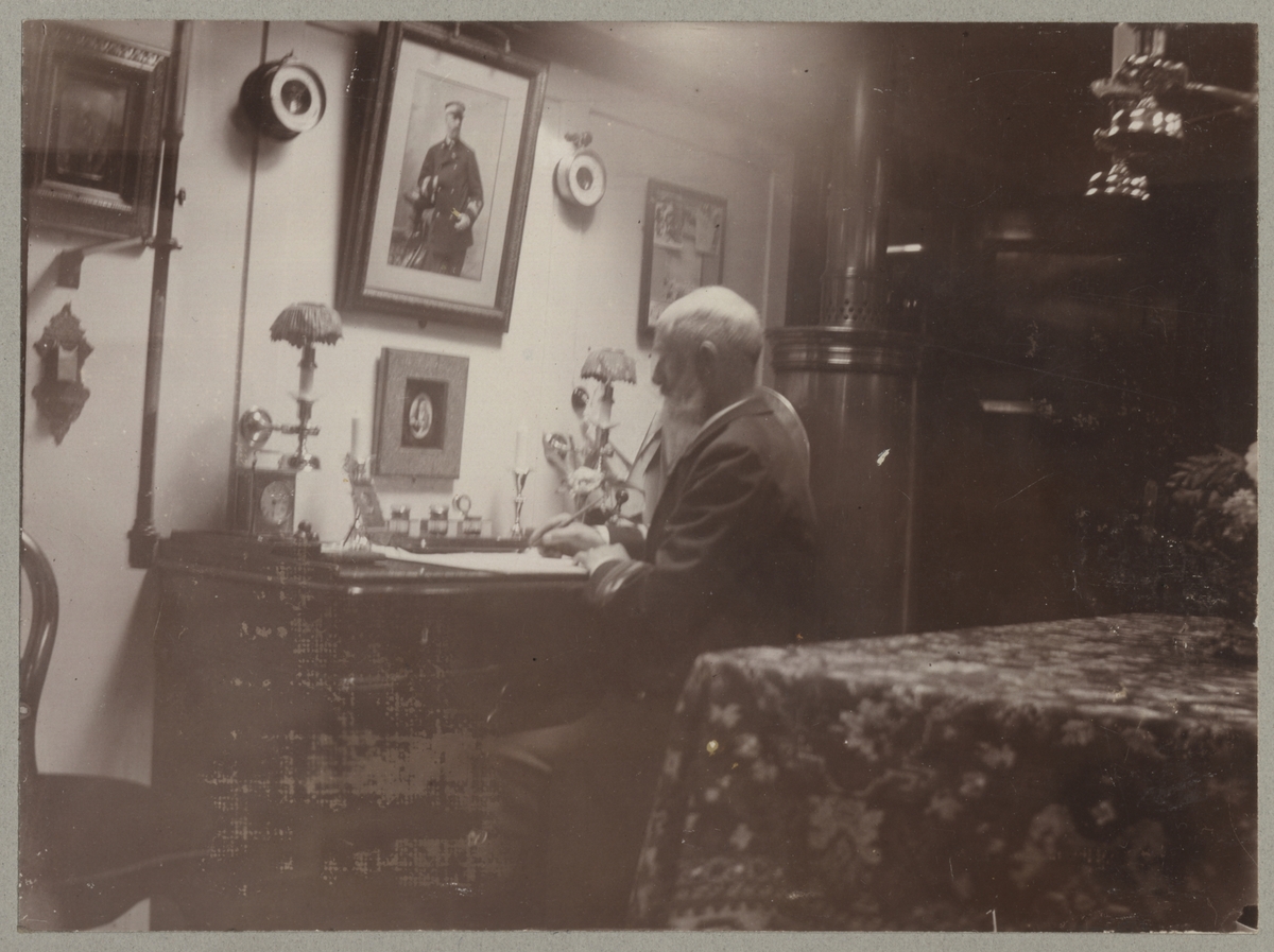 Titel: Rudof Nissen sitter hemma vid sitt skrivbord och skriver någonting.