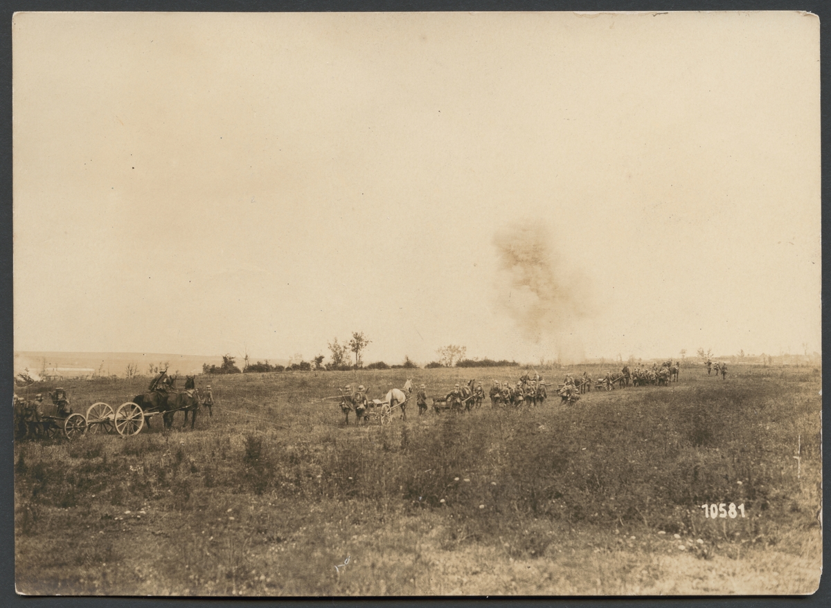 På bilden syns en kolonn hästdragen fältartilleri som passerar över ett fält. I bakgrunden ser man rökmolnen efter en exploderande granat. Längst till höger kan man urskilja en by.