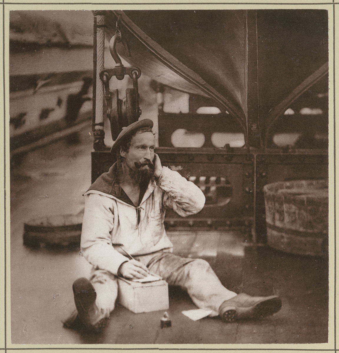 Bilden visar en sjöman som sitter på däcket på korvetten Stosch och kommunicerar med hemladet. Även om det ser ut som att han pratar i mobilen så skriver han naturligsvis ett brev.