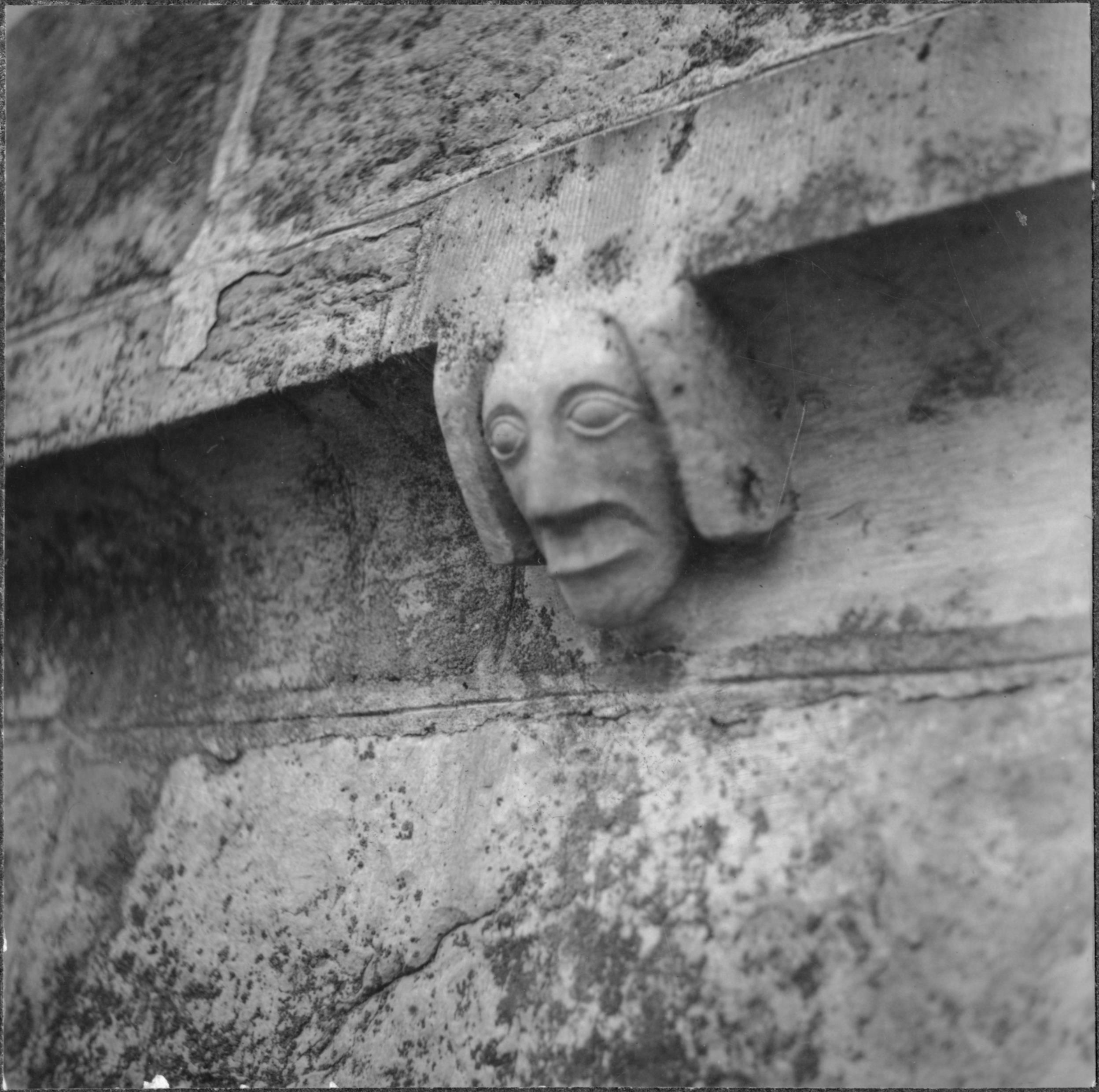Skulpterat huvud, nummer ett av fyra, under stora övre fönstret på västfasaden. Fotograferat när fönsterrutorna byttes efter branden 1936.