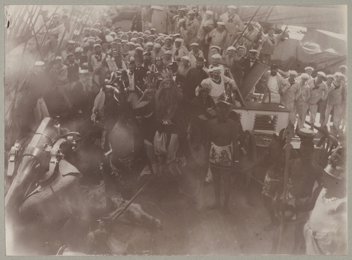 Havets kung har kommit ombord på Balder med sin hovstat. I förgrunden syn hans svartmålade polisstyrka och i bakgrunden manskapet i spänningsfull förväntan. Bilden är tagen från ett förhöjt ståndpunkt, antagligen kommandobryggan. Förmodligen ser man hur Neptun tillkännager fartygschefen hans ankomst.