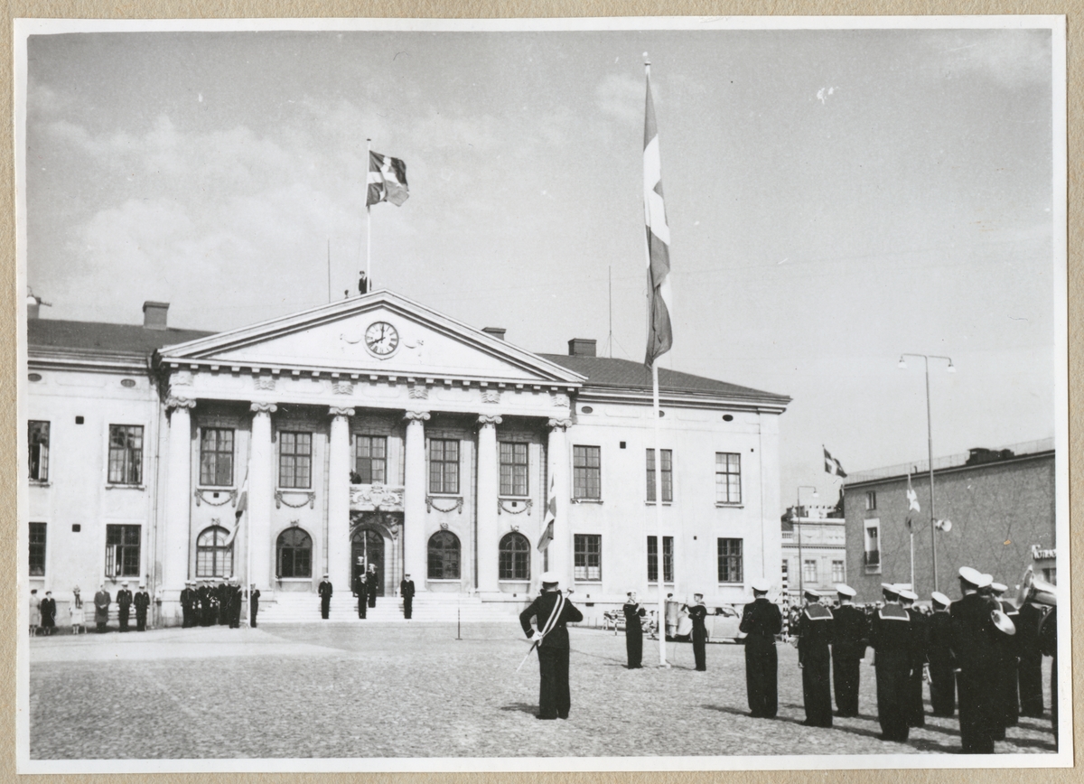 Marinens musikkår står på Stortorget i Karlskrona framför rådhuset och spelar medan fyra svenska flaggor, tre på torget och en på rådhuset, antingen hissas eller halas. På rådhusets trappa står ett par militärer och gör honör. Utanför rådhuset står några civila åskådare.