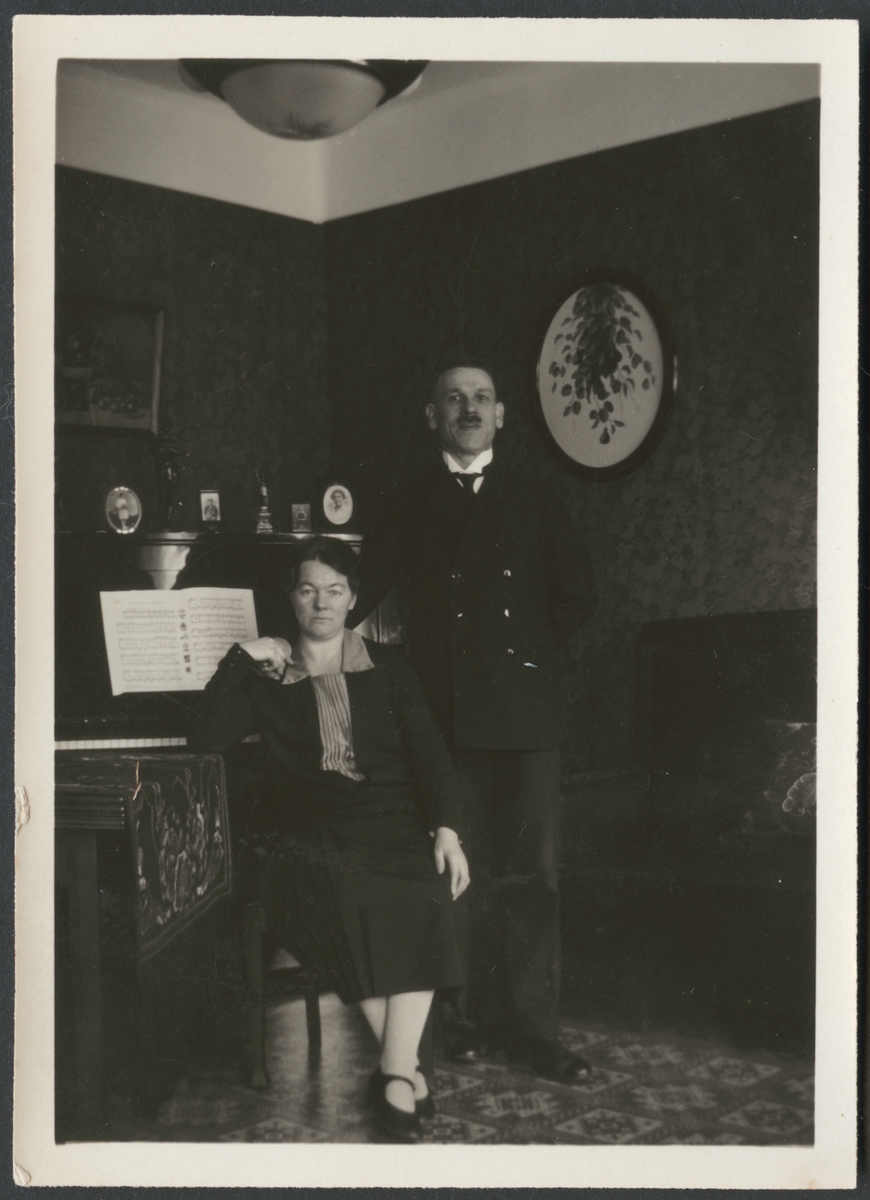 Porträttfotografiet visar Carl Svensson med sin fru i vardagsrummet. Hon sitter på vid ett bord framför en piano med en uppslagen notblad. Han står på hennes vänster sida med höger armen vilande på hennes axel.