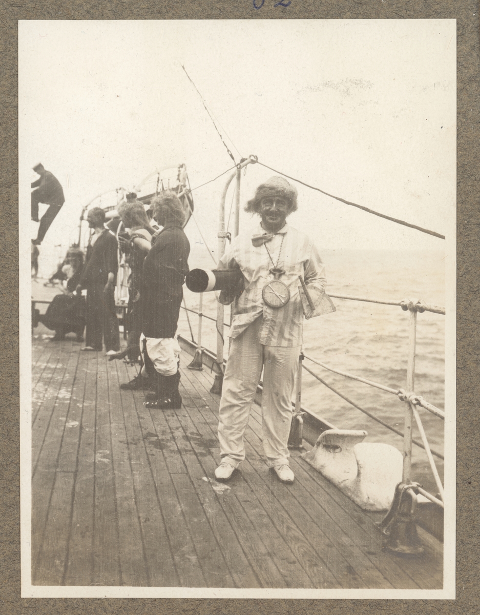 Bilden föreställer antagligen navigatorn i Neptuns hovstat under linjedopet ombord på Fylgia. Han är utrustat med en stor klocka och en sextant i trä. Hans uppgift är att kungöra tidpunkt och position när fartyget passerar ekvatorn.