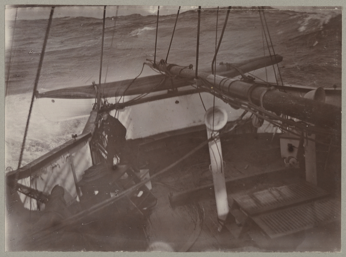 En sjöman står i aktern framför livbåten medan Balder seglar i hårt väder. I bakgrunden syns ståra vågor.