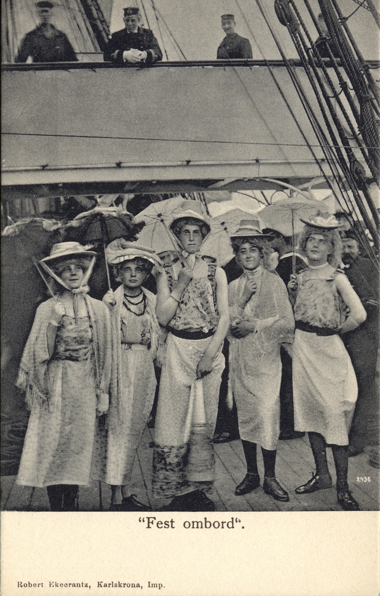 Vykort från midsommarfesten ombord. Från vänster kommendörkapten Sixten Graaf, kapten Adolf von Bahr, generalkonsul Fredrik Adelborg, kommendör Gösta Granström och direktör Carl Cramér.