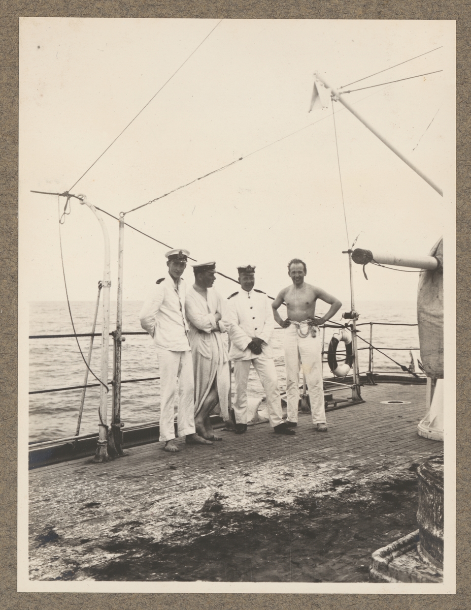Bilden föreställer fyra sjömän efter linjedopet ombord på Fylgia. En är klädd i badmantel, en annan har bar överkropp, framför de syns resterna av rengöringen.