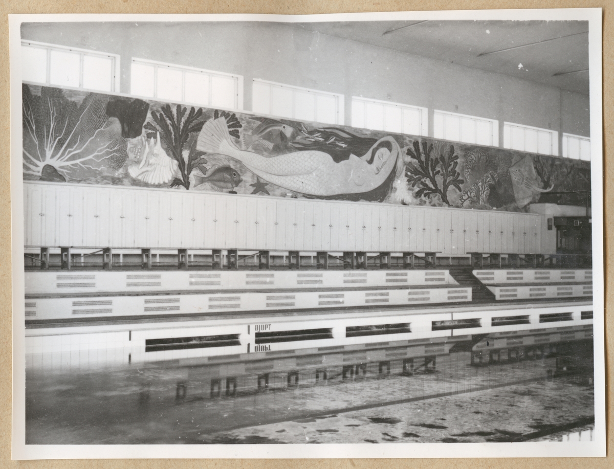 Simbassängen på Sparre Simhall, interiört. I bakgrunden syns en muralmålning ovanför en rad skåp föreställande en sjöjungfru omgiven av fisk och koraller. Konstnär: Erik Ahl????