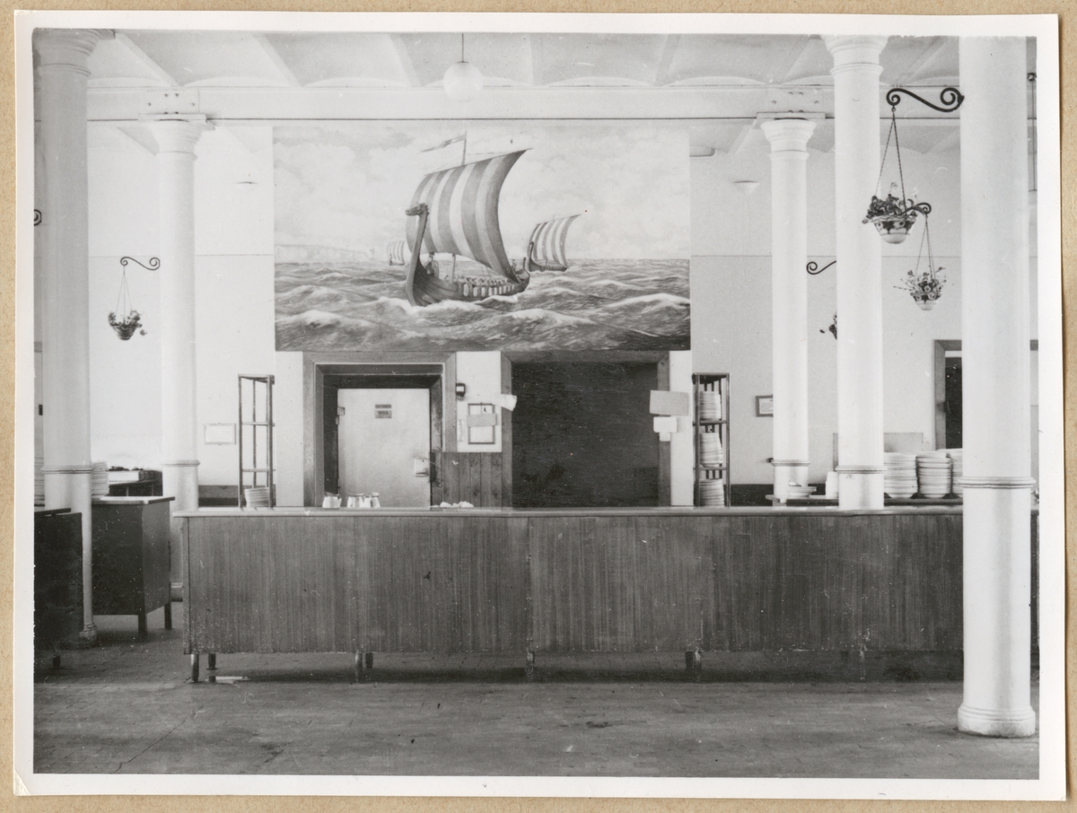 Matsalen tillhörande bataljon Sparre. Taket bärs upp av kolonner och på väggen sitter en målad tavla föreställande ett vikingaskepp.