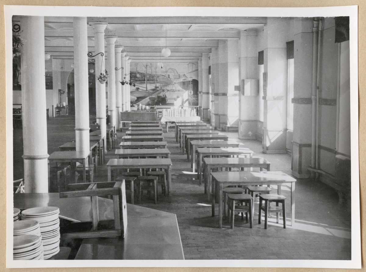 Matsalen tillhörande bataljon Sparre. Taket bärs upp av kolonner. Rummet är inrett med flera bord och pallar. På väggen finns en stor målning, troligtvis utförd av Arvid Nilsson. Målningen fanns fortfarande kvar 1984.