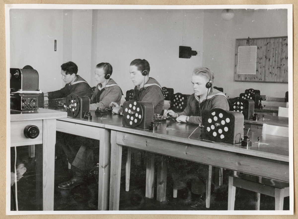 Titel: Flottister i uniform sitter ned vid bord med telegrafer på och lyssnar i hörlurar.