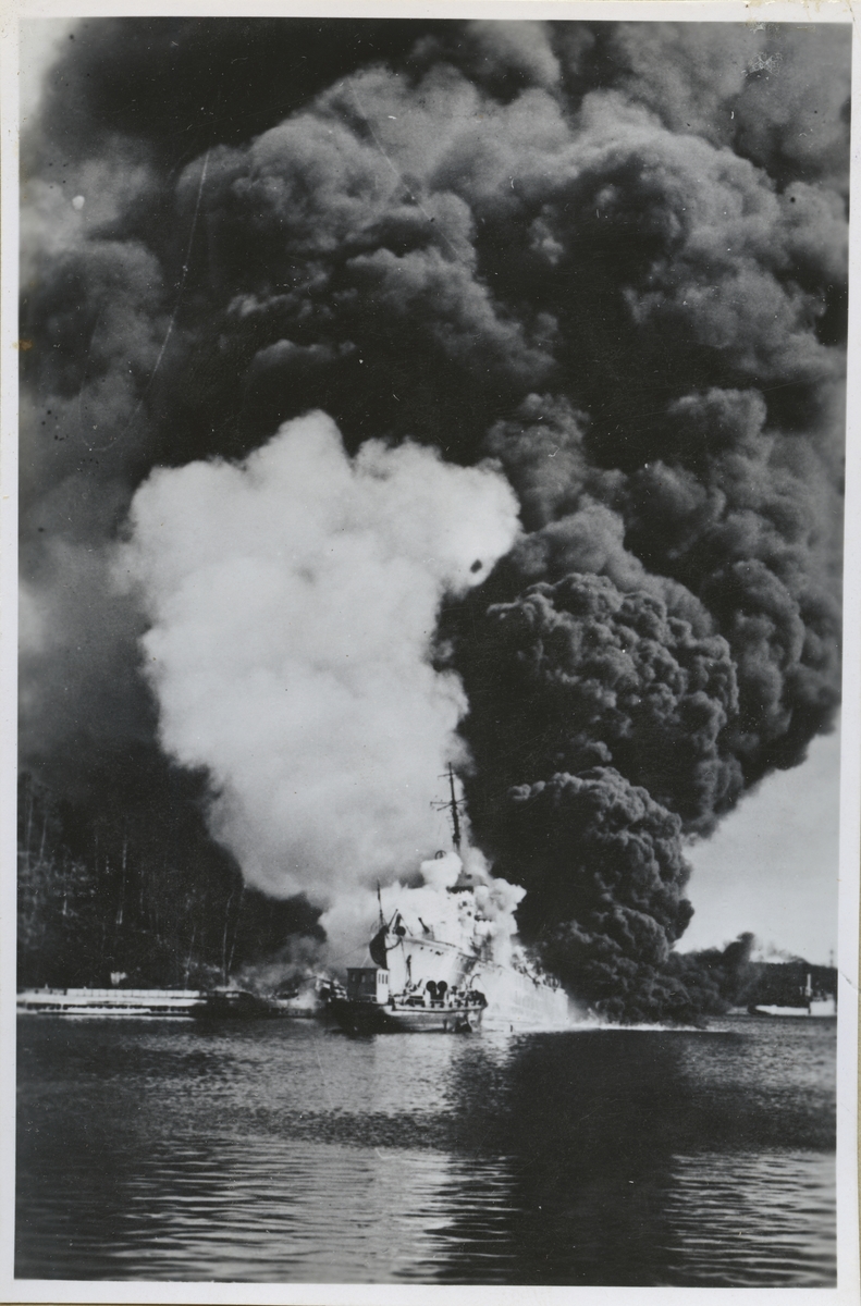 Fotot visar ett rökfyllt fartyg, olyckan vid Hårsefjärden. Rök fyller omgivningen. En mindre båt syns i förgrunden.