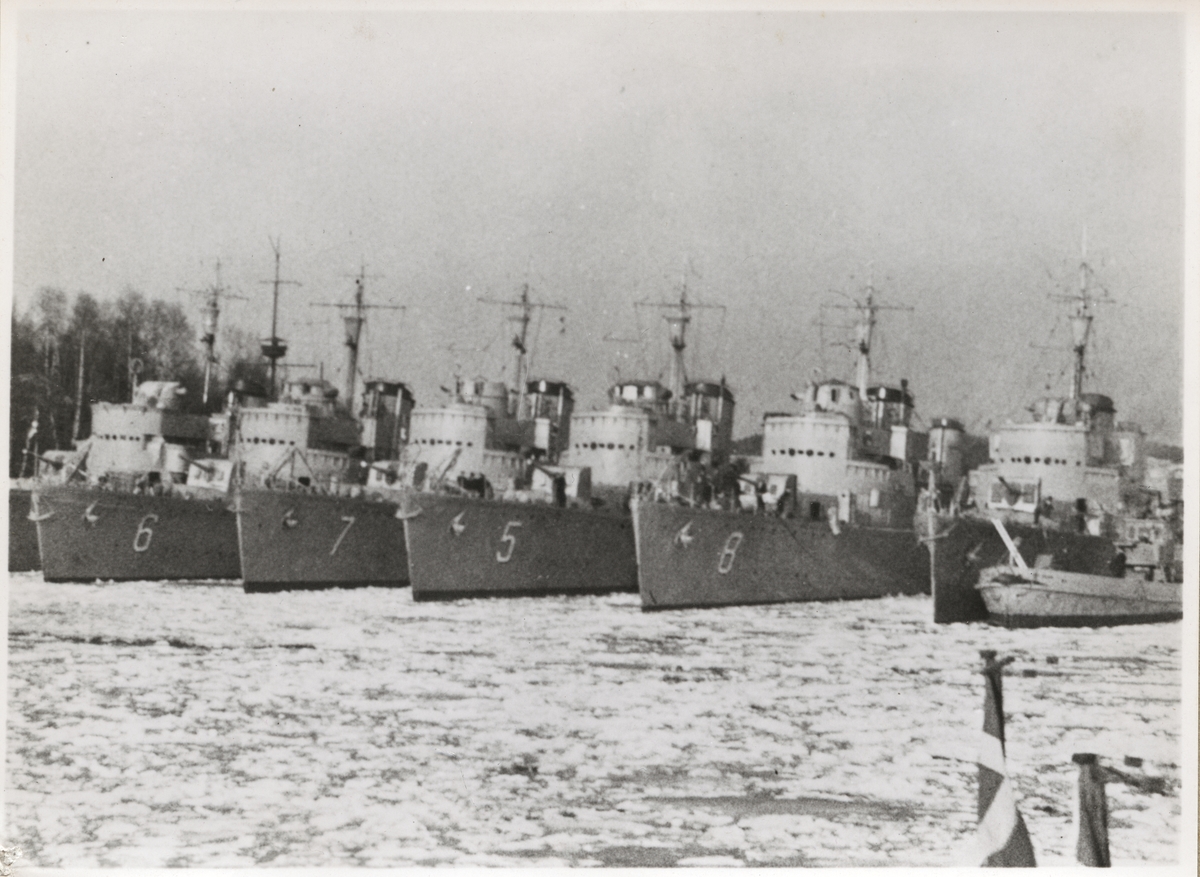 Flera fartyg (Jagare) på rad under vintern täckta med is.