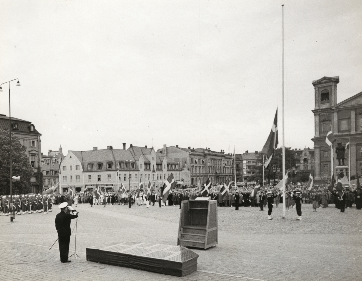 Titel: Flagghalning på Stortorget med marinen. Sjöbefäl gör honör framför stor publik och matroser.
