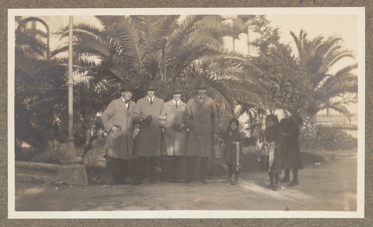 Bilden visar fyra finklädda herrar som bär kappa och hatt i en trädgård med palmer. Mannen till höger håller en liten flicka i handen. Hon bär en korg på höger handen flera kedjor hänger över hennes vänster arm. Bredvid henne står ytterligare två flickor som också har kedjor med sig.