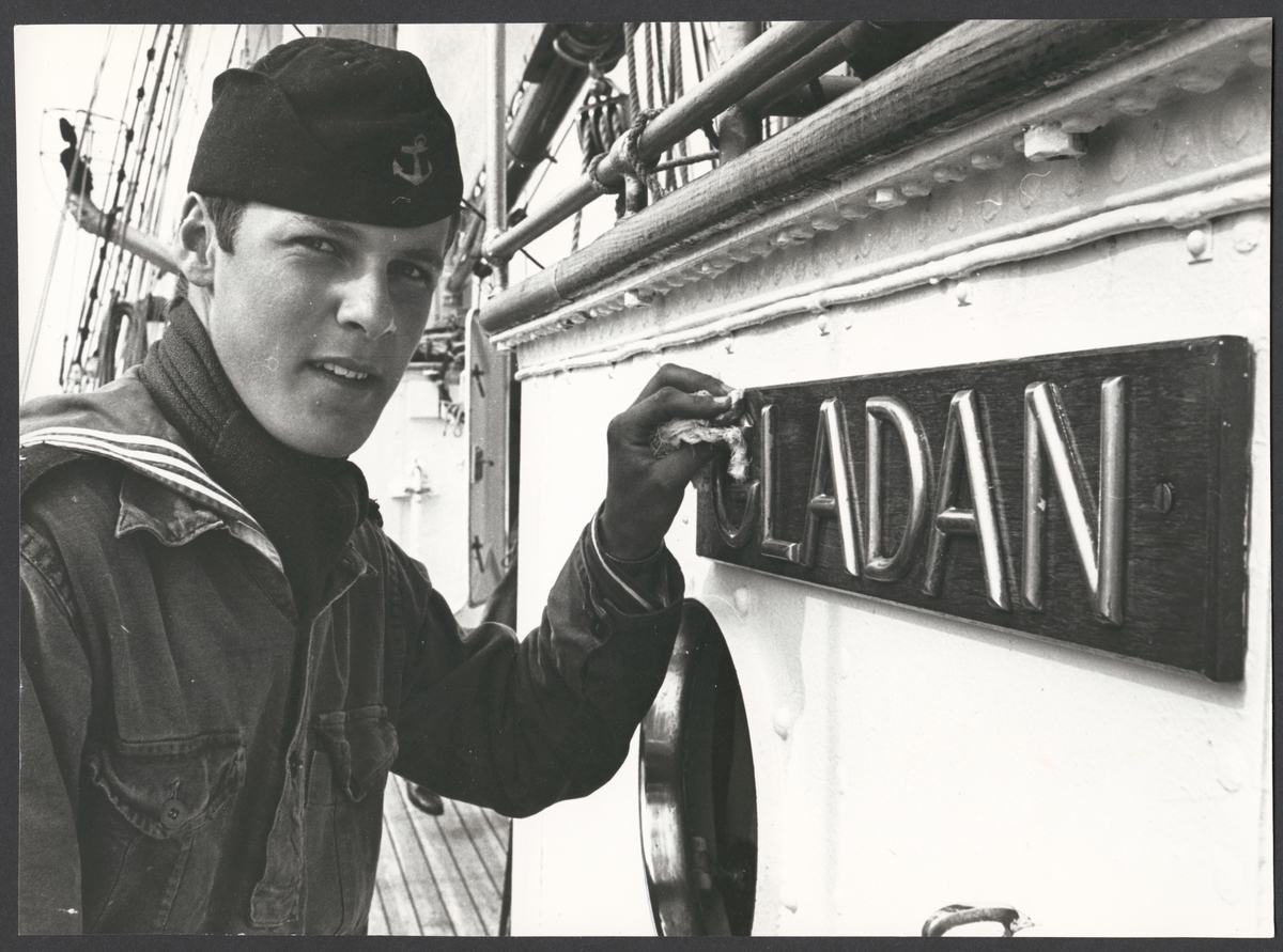 Titel: Bilden visar en kadett på Marinens skolfartyg Gladan som håller på att polera namnbrädet.
