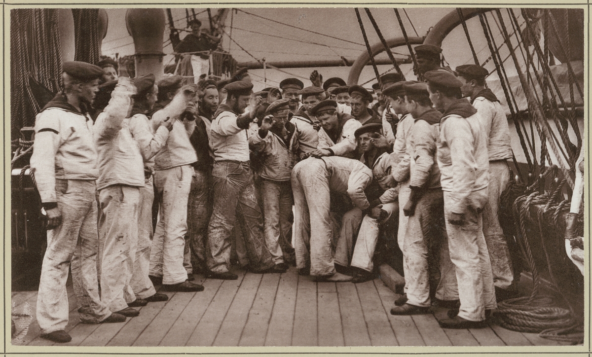 Bilden visar manskapet ombord på korvetten Stosch som njuter av fritiden med en lek som heter "Frischwachs". Under spelets första moment gömmer en spelare ansiktet så att han inte ser någonting, sedan får han en slag på rumpan.