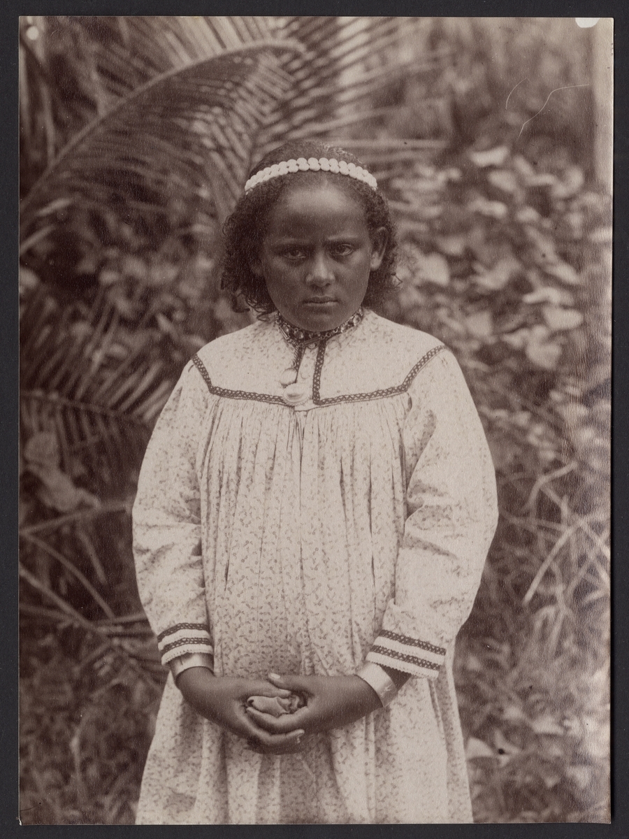 Bilden visar en flicka från ursprungsbefolkningen på Marshallöarna. Enligt Etnografiska museets bildtext är det: "Mary, prinsessa (?), fotograferades av Oscar Ekholm 1884 under Vanadis världsomsegling. Dotter till Tui och kung Kabua." Hon är klädd i en modern klänning och bär olika smycken, t. ex en kedja av snäckor på huvudet och armband.