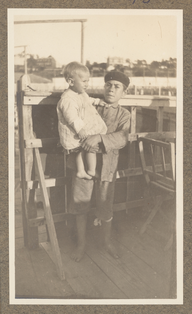 Titel: Bilden visar en pojke som bär ett barn i famnen.