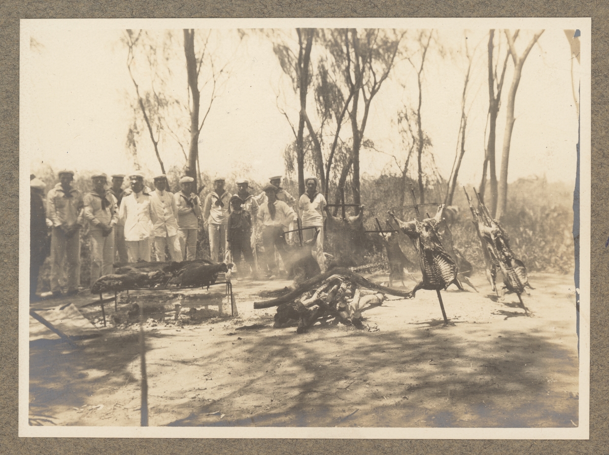 Bilden visar en grupp sjömän från Fylgia som tittar på en stor grillplats där en det hållas på att förbereda en Asado, en sydamerikansk grillfest.