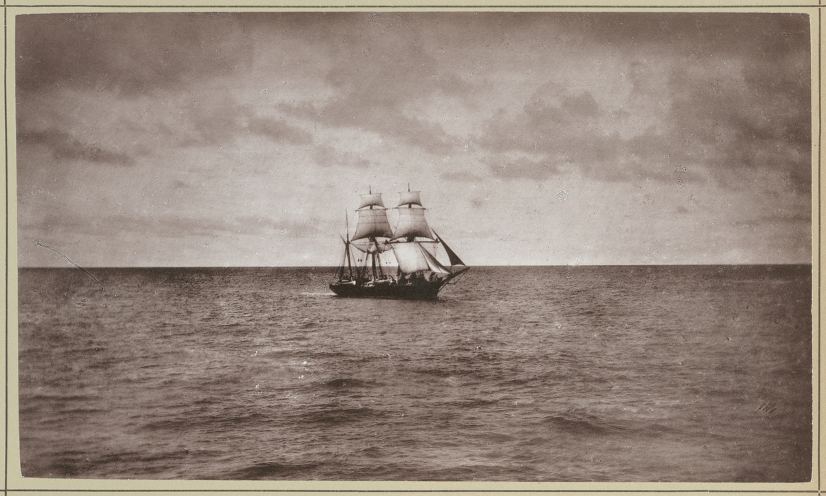 Bilden visar den tyska kanonbåten SMS Wolf till havs. Ångfartyget är riggat som barkentin seglar i medvind.