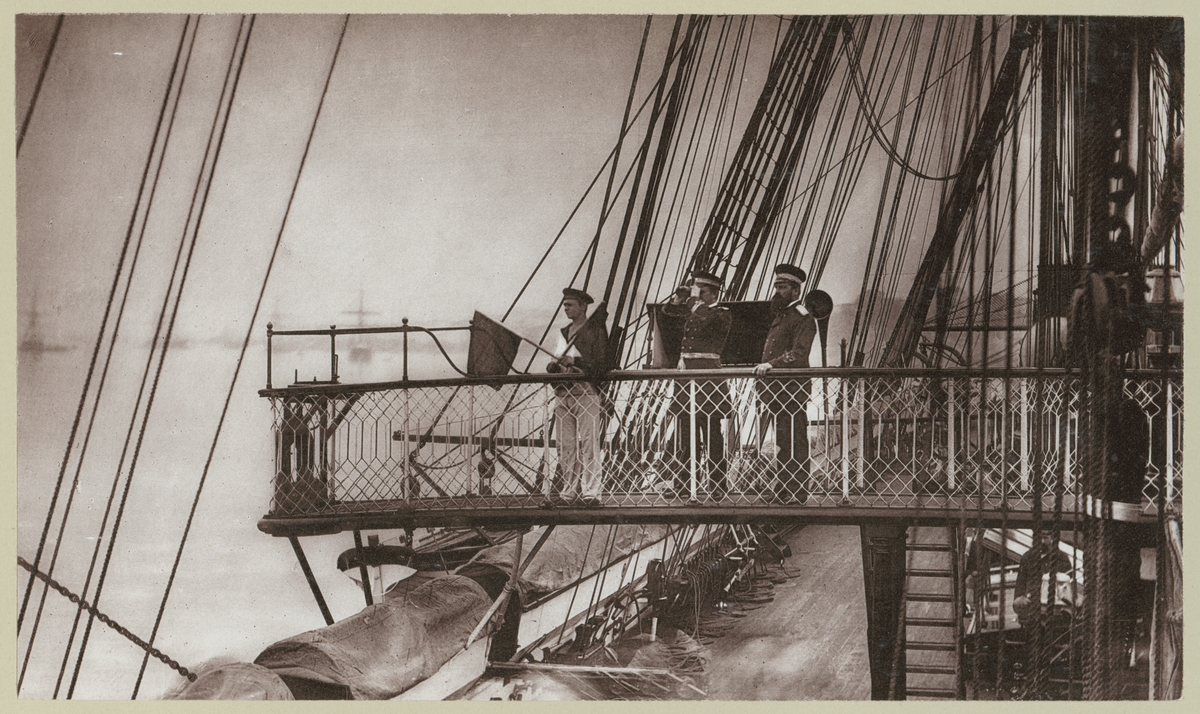 Bilden visar signaling av morsetecken med hjälp av flaggor ombord på den tyska korvetten Stosch.