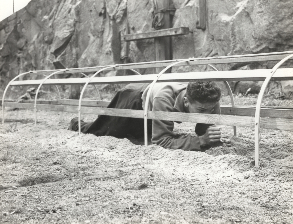 Titel: Ung man kryper i en tunnel under träning.