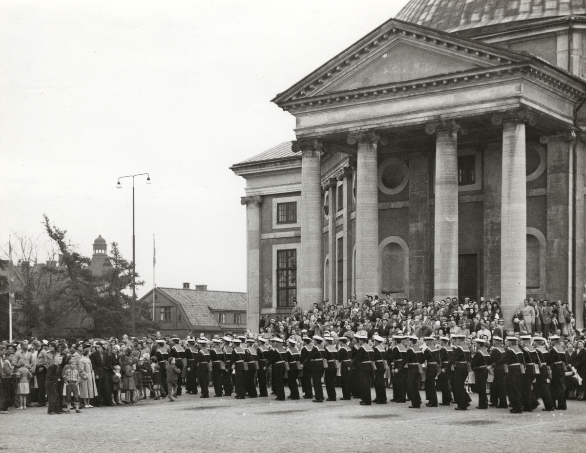 Titel: Matroser uppställda framför Tyska kyrkan i militär march. I samlingen syns också civila åskådare.