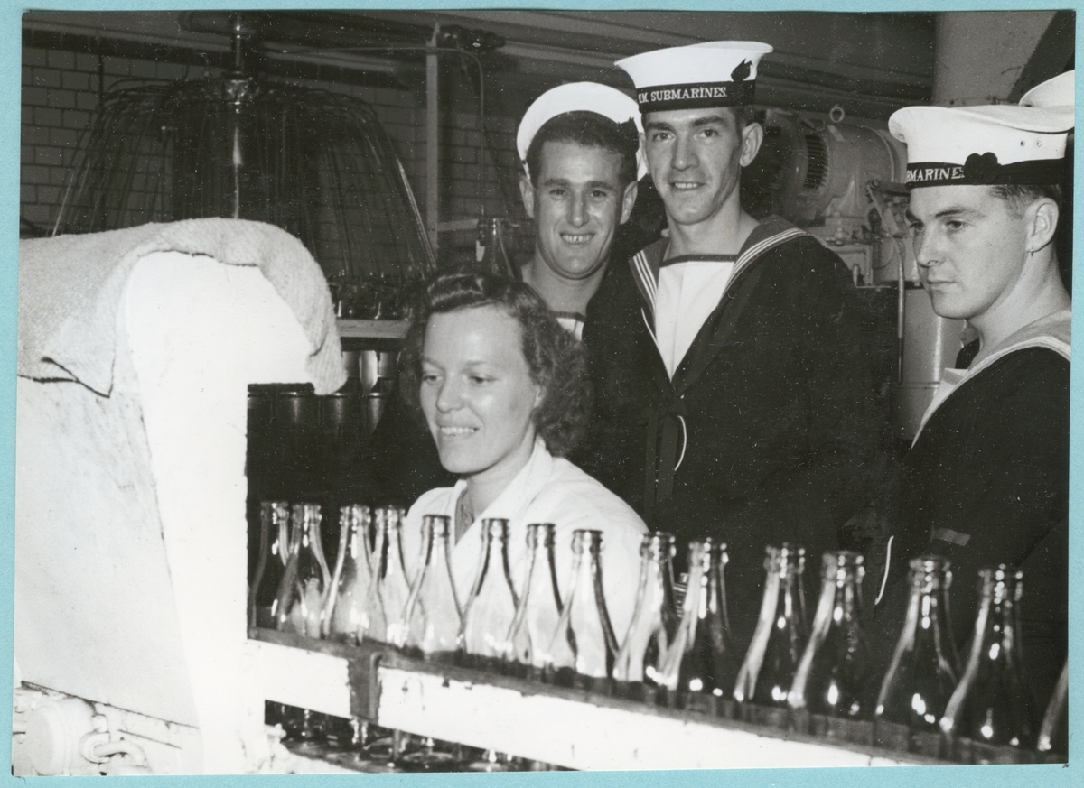 Från besöket på tyska bryggeriet på Wämö. Tre engelska flottister, två med texterna "H.M. SUBMARINES" på mössorna, står barkom en kvinna framför ett löpband med glasflaskor. Två av dem ser in i kameran. Från Engelska besöket i Karlskrona den 9-14 september 1951.