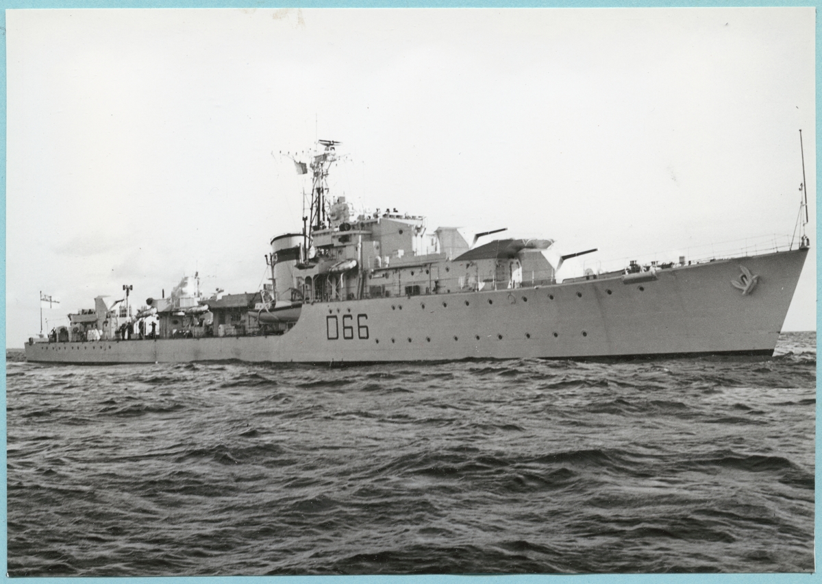 Engelska jagaren H.M.S. Zambesis styrbordssida. Från Engelska besöket i Karlskrona den 9-14 september 1951.