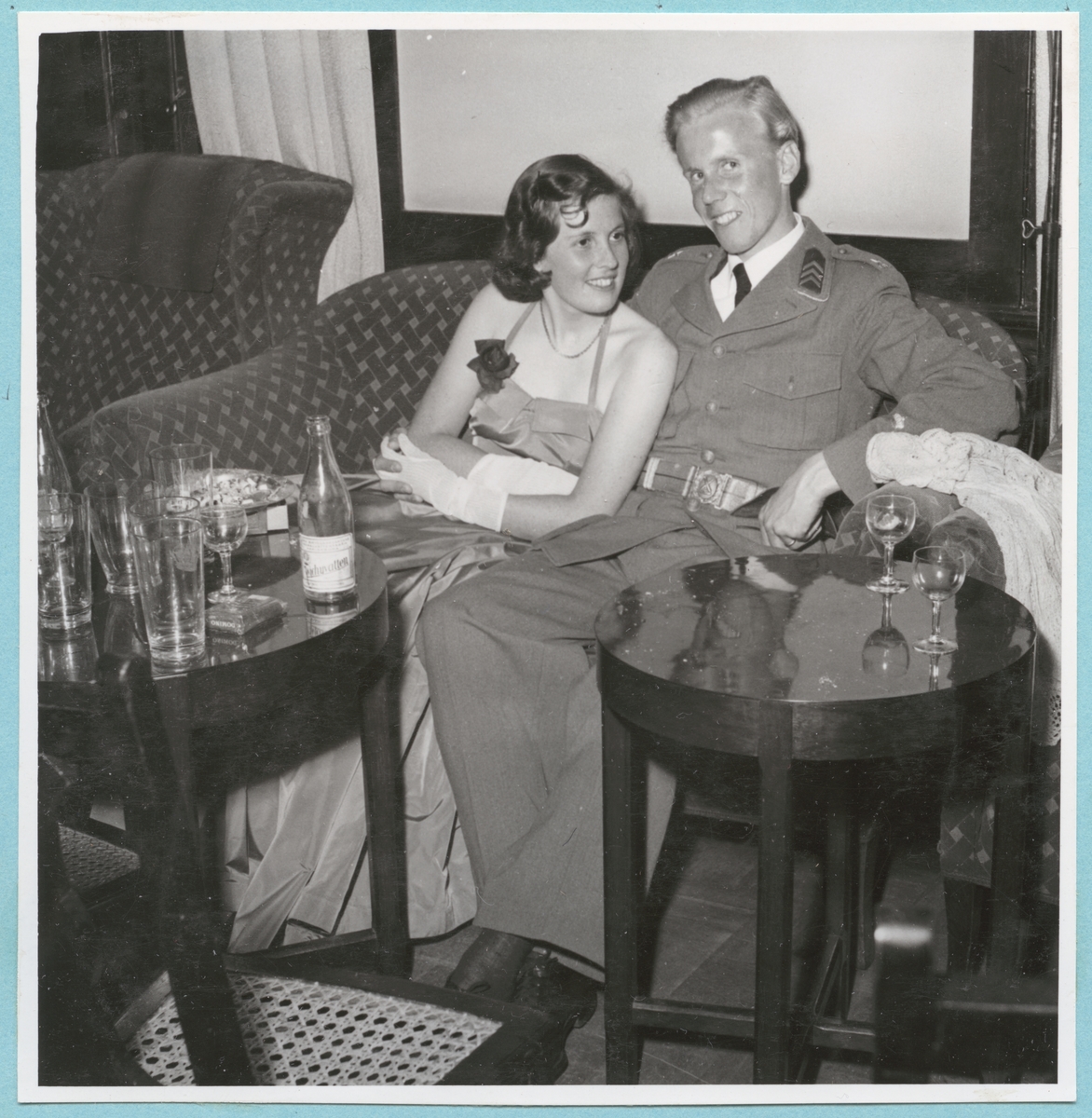 En uniformsklädd militär från armén sitter i en soffa tillsammans med en kvinna i klänning. Paret håller varandra i handen. Framför dem står två små bord med flera glas och flaskor på. Bredvid soffan står en fåtölj med likadan klädsel som soffan.