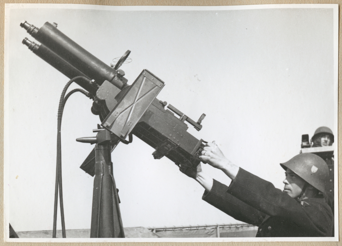 Titel: Ett vapen siktas av en uniformsklädd man med hjälm ombord på ett fartyg.