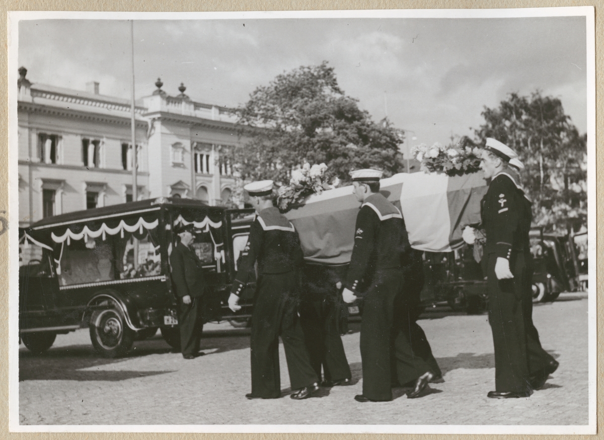 Bilden visar jordfästningen av sex av offren från ubåten Ulven fredagen den 6. augusti 1943 i Fredrikskyrkan. Sjömän bär likkistor ut ur kyrkan.