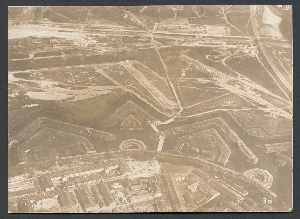 Denna flygbild visar en detalj från fästning med klassiska bastioner. Området i övre delen liknar ett flygfält.
