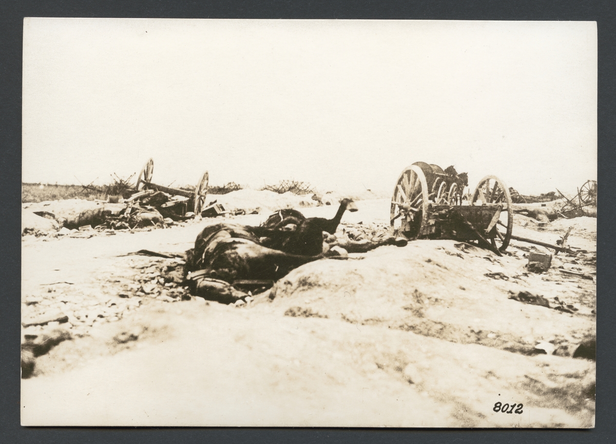 Bilden visar döda hästar och förstörda vagnar efter ett angrepp på en trängtrupp.