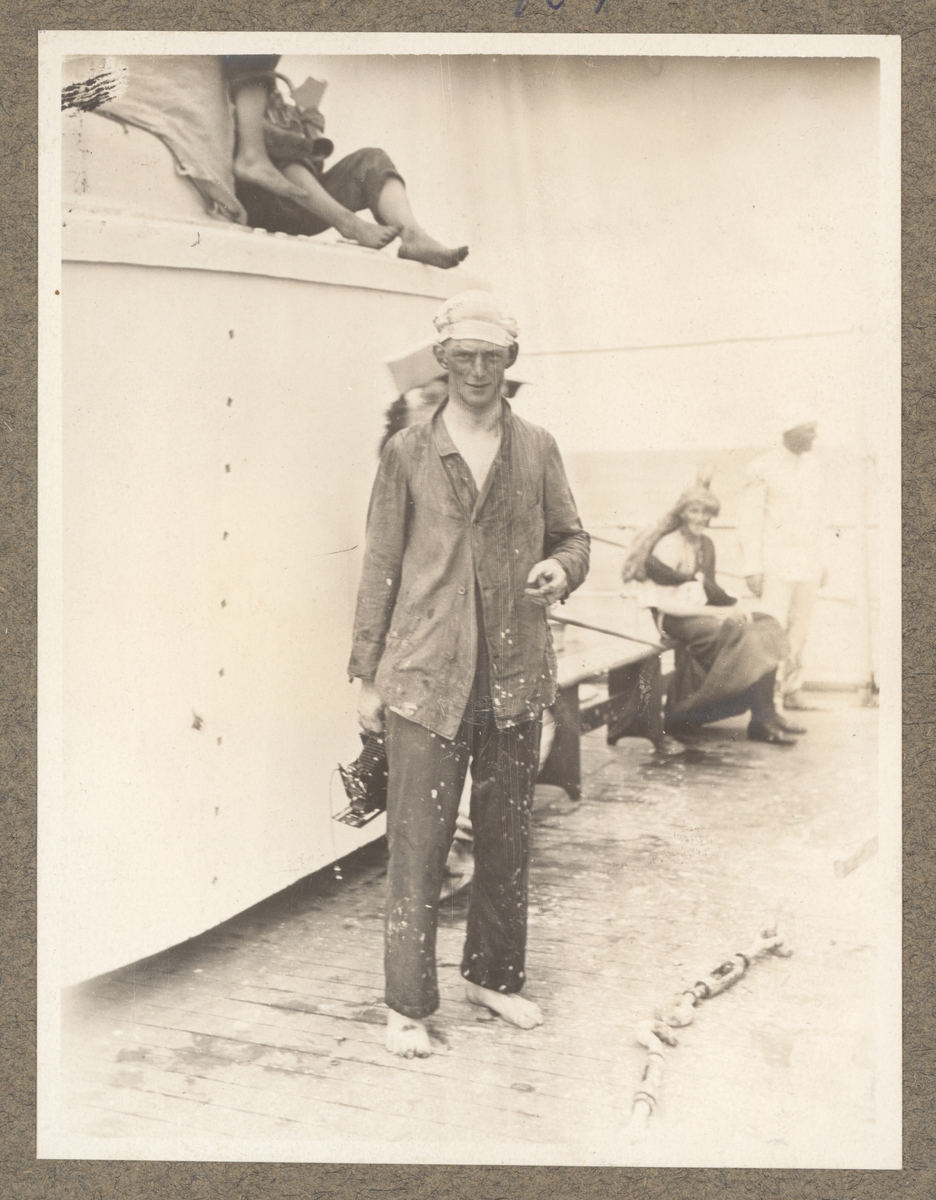 Bilden föreställer en sjöman efter linjedopet ombord på Fylgia. Han är barfotat och röker en cigarr. I bakgrunden vilar en princessa.