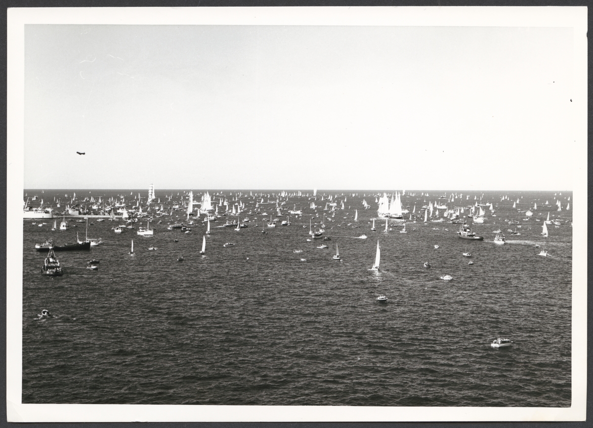 Titel: Flygbild som visar en stor mäng segelfartyg under starten till Tall Ships Race i Göteborg 1968.